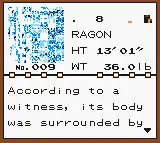 .8 is a Water-type glitch Pokémon found only in Pokémon Yellow Version. It is a hybrid of Blastoise. It can only be encountered by the Time Capsule exploit with Ledyba. It occupies hexadecimal slot CC and will become a PkMn ◣ n if traded to Pokémon Red and Blue. Its data entry, weight and height are the same as Dragonair's. The only differences are the sprite and the fact that its species appears as RAGON instead of DRAGON, just like 4. ..