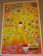 The 1999 Burger King promotional Pokémon toys were a set of toys distributed with Kids Meals at Burger King from November 8 to December 31, 1999.[1] All toys were paired with trading cards, which were made exclusively for this promotion. The toys were used to promote Pokémon: The First Movie. There are 59 toys in total (although it was promoted as 57 due to 3 of the toys being variants of each other). There were also a set of six 23-karat gold plated cards which came in Poké Balls that were available to buy at the restaurant chain that year. The promotion used the slogan "Gotta catch 'em here!", a parody of the Pokémon slogan "Gotta catch 'em all!".
