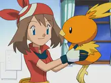 - May starts her Pokémon journey with a Torchic, a Pokédex, and six Poké Balls.