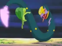 The Rocket trio recites their motto, and the delay allows Meowth to trap Pikachu inside an electricity-absorbing cage. Ash, enraged, sends out his Taillow. James orders out Cacnea, but the Pokemon gives him a spiny hug before launching a Pin Missile. However, Taillow flies through the attack with ease. Jessie then sends out new partner, Seviper, and the group are surprised to see that it's the same one they had faced before. Treecko steps forward. Ash halts its advance, reminding Treecko that it isn’t alone and has friends it can now rely on. Treecko replies with an affirming grin before returning its attention to Seviper. Seviper prepares to lash Treecko with a Poison Tail. Though Treecko evades using Quick Attack before delivering a Pound attack to the face. Seviper attempts another Poison Tail, but Treecko leaps into the air and strikes back with its new spinning manoeuvre. The blow sends Seviper flying into Team Rocket and Pikachu's containment chamber rolls away. Pikachu emerges and happily leaps into Ash's arms. Treecko declares that it has now had its revenge, having defeated Seviper, and says Pikachu can finish things off. Ash orders Pikachu to use Thunder, and the attack sends Team Rocket blasting off. Ash thanks Treecko for battling for him, and finds he's won Treecko's trust when Treecko holds out its tail. Ash and Pikachu shake hands with Treecko's tail, laughing happily.