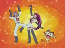Meanwhile, Team Rocket has been watching Seviper almost effortlessly dispatched the twerps' Pokémon, so they decide they want to catch it. They see that it likes fruit, so they lure it with a basket of fruit left on the other side of a pitfall trap. However Seviper just picks up the basket with its tail, stretches over the pit, and slithers away. Team Rocket are left red-faced, and in their anger they stand directly over their own trap, which soon gives way. However, they don't let it discourage them. The trio put another plan into action, but their net doesn't work either as Seviper just bites through it.