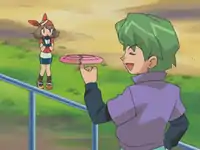 The group then heads to a more isolated part of the shore, where May decides to show off Beautifly's Silver Wind technique. However, the move fails. May slumps down, groaning that this is going to take a lot more practice. Ash suggests she try the Frisbees again and she agrees. May throws three Frisbees to Beautifly, who gently Gusts them back. May gracefully catches the first two though the third goes flying over her head. The group turns around to see it sail straight towards a green haired boy that is watching from the promenade. He catches the Frisbee easily and twirls it on his finger, stating that May isn't a very good contestant for a Contest. May gets mad as the Frisbee is thrown at her feet. The boy jumps down and May angrily introduces herself. The boy introduces himself as Drew, and tells her that she needs a lot of practice. May becomes enraged and lunges at him, but he just holds his hand up to her face and casually pushes her back. Ash, Max, and Brock approach and ask what is going on. Drew antagonizes May with his sharp comments, and he keeps at bay with his hand as she tries to rush at him. Ash tells him to stop insulting May's Pokémon, but Drew just flips back his hair and laughs. He explains that he plans on competing in the Contest too, and he's staying at a luxury hotel and not some cramped Pokémon Center. Ash and the others turn to leave, but May turns back. She informs him that she'll see how good he really is at the Pokémon Contest. The two then glare at each other.