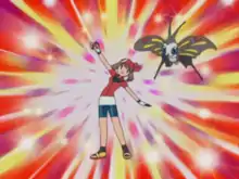 May battles against Jessie, with Beautifly delivering enough of a beating to break the rainbow device and defeat Dustox. Caught cheating, Jessie is disqualified. Team Rocket tries to make trouble, but Pikachu sends them blasting off.