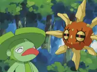 As Ash and his friends continue their journey back to Petalburg City, they realize that they’re out of water. However, Brock reveals there is a world-famous freshwater spring nearby. Meanwhile, Team Rocket are setting up another trap at the spring. They see Ash and the gang coming, so they hide and wait. Max and May are nervous about the dense forest, which is only made worse when a Zubat that flies out of a nearby bush, scaring the group. Then they're distracted by a Solrock floating nearby, and as they go to follow it they find themselves at the bottom of a hole. The Rocket trio emerge victorious from their hiding place and grab Pikachu out of the hole with a net. A Flamethrower suddenly knocks over Team Rocket, causing them to drop Pikachu back in the hole. It turns out to be the Solrock who decided to help. While Team Rocket is busy, Ash and the others manage to climb out of the hole. Ash discovers from his Pokédex that Solrock can read people's minds. James has Cacnea use Pin Missile on Solrock, but to no effect. Solrock angrily responds with a Solar Beam to blast Team Rocket off. When the smoke clears, Solrock has disappeared.