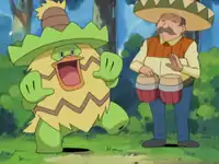After trying to get oranges out of a tree, the Pokémon are captured by Team Rocket in a net. Grovyle cuts the net and frees the Pokémon, and everyone congratulates the Grass-type. The gang sits down for lunch, but are interrupted by a dancing Ludicolo and its Trainer Poncho. Poncho challenges Ash to a battle; if Poncho wins, he gets the kids' lunch.