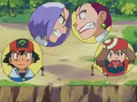 Andi and Oscar encounter Team Rocket next. Jessie and James agree to battle only so they can steal the couple's Pokémon, but are soundly beaten. Jessie and James blame each other for the loss.