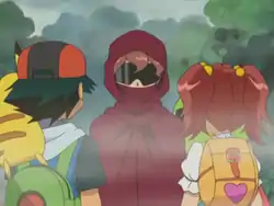 The group makes their way through the fog-filled forest on Kirikiri Mountain, though Ash quickly becomes separated from the others. Team Rocket are trying to follow the twerps, but are finding themselves lost in the foggy conditions. Ash soon slips down a steep hill, and at the bottom he and Pikachu hear singing. They begin to walk towards the source. Through the fog they make out what appears to be a woman in a burgundy robe with glasses, chanting a song. Ash rushes off to find his friends, but he encounters a Baltoy instead.