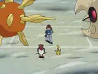 Liza admits that Ash’s match cannot go on because the Gym field was destroyed. Though Rachel suggests that they just have the battle outside, on the cliff that Team Rocket took off from, and everyone agrees that this is a good idea. So Rachel announces the continuation of the Gym battle. Pikachu uses Thunderbolt on Solrock, but Lunatone slides in front and guards it with Light Screen. The Thunderbolt gets reflected back at Pikachu, smashing him into a rocky cliff. Swellow tries to attack Lunatone with Aerial Ace, but Solrock uses Sandstorm to stop it. Brock admits that the twins are working in sync since that battle with Team Rocket. Ash also realizes this and orders his own combination, so Pikachu leaps onto Swellow's back. The now-airborne Pikachu uses Thunderbolt on Solrock, but Lunatone again intervenes and reflects the attack right back at him. However, this time both Pikachu and Swellow are hit. Tate and Liza are surprised to see that Swellow doesn't seem to be affected, considering that it's a Flying-type.