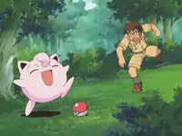 They set out a bowl of Brock's special Pokémon food as bait, but Jigglypuff does not care for it, to Brock's dismay. May then tries to offer it Professor Oak's Pink Surprise Pokéblock, but Munchlax swipes it away in a flash. After thinking for a bit, Max figures out a plan to put Jigglypuff to sleep, making it easier to capture. As part of the plan, Mitch lures Jigglypuff into a battle. Loudred's Hyper Voice hits Jigglypuff, at which point Ash says that it can only escape now by using Rollout. Sure enough, it does, and rolls straight towards Loudred, who dodges at the last second. Unable to stop itself, Jigglypuff rolls into the metal cladded cabin. Ash and Brock promptly shut the door behind it. Pikachu appears inside as well and uses Thunderbolt, which reflects many times but still misses. Jigglypuff uses Flamethrower, which also bounces around, hitting neither Pokémon. Jigglypuff bounces off the walls, dodging Thunderbolts until it slams into Pikachu. Both land on the floor, but Jigglypuff begins to Sing. Pikachu drifts off to sleep, but the metal also reflects the musical notes, sending Jigglypuff to sleep too. Ash awakens Pikachu and Brock urges Mitch that now is his chance. However, he realizes that Jigglypuff would be better off living freely in the forest and decides not to catch it. Mitch believes that Loudred would be a good enough present and the group leaves the woods. Jigglypuff wakes up later that night to a full bowl of Pokémon food, but appears saddened.