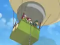 The kids and Psyduck walk along until they reach a hill where a disguised Team Rocket coerces them into trying out "grass-sledding." But as they're coasting down the grassy hill, Jessie activates a trap that sends the kids barreling around like pinballs and then Meowth catches Psyduck and Phanpy in a net. Team Rocket begins to escape with the two Pokémon using their balloon, but Machop, Machoke, and Machamp show up just in time to pull them back down. Team Rocket is sent blasting off, and Emily arrives to take her Psyduck home.