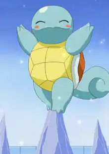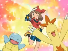 May prepares her team for the upcoming Silver Town Pokémon Contest when she loses Squirtle backstage. During her search, May approaches Mandy and her son Nicholas for insight. However they admit they haven't seen Squirtle, and rush off to continue their own search for someone themselves. Just then, Ash, Brock, and Max appear, to which May explains that she's lost Squirtle. Brock smiles and tells her that Squirtle is right here. At this, Squirtle appears from behind Brock's leg wearing lots of flowers, much to May's delight.