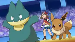 The crowd cheers as May makes her way into the middle of the arena. With a rotation of her wrist, a solitary Poké Ball is released into the stadium exploding with a bright light releasing Munchlax. Munchlax begins collecting energy from the sunlight launching a powerful Solar Beam. As the beam of energy ascends into the air, Munchlax propels into the air clashing with the energy with a Focus Punch. As the two forces clash, the sunlight slowly dissipates into the atmosphere creating a glimmering effect, as well as a bell-like chime. Backstage, Solidad is incredibly impressed by May's usage of both visual and auditory effects, and even Harley is forced to admit he thought that May was very impressive.