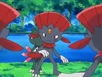 While heading towards the Battle Pyramid for Ash's final Frontier challenge, the group takes a break in a forest clearing. Aipom, interested in the flowers, wanders off and gets lost, coming face-to-face with a wild Weavile. Weavile challenges Aipom to a battle, starting with Shadow Ball; the explosion alerts the group that Aipom is in trouble. Rushing over, May scans the Weavile with her Pokédex. Ash asks if the Weavile wants to battle, to which it replies with another Shadow Ball. The gang quickly moves out of harm's way, only to be attacked by another Shadow Ball. Ash has Pikachu use Thunderbolt, though Weavile evades and replies with another Shadow Ball. Pikachu attempts to dodge, but gets caught in the crossfire. Aipom quickly covers for Pikachu, although Weavile dodges her Swift attack. Ash tells Aipom to use Double Team, followed by Swift. Still, Weavile is able to dodge and goes straight into a Shadow Ball attack, hurting Aipom and knocking her out. While Weavile leaves the scene, Jessie of Team Rocket hopes to add the aggressive Pokémon to her team. Meowth advises against it, and soon leaves to fight Weavile on his own.