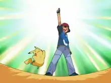 With Pikachu immobilized, Regice uses Rest. Pikachu uses Iron Tail to free himself. Pikachu races towards Regice, but it wakes up and fires Ice Beam, this time making a direct hit and freezing Pikachu in an ice pillar. Ash orders Thunderbolt, but Pikachu seems unable to. The referee begins to declare Pikachu unable to battle, but Pikachu uses Thunderbolt to shatter the ice and paralyze Regice again. Regice fires another Focus Punch to send Pikachu bouncing across the ice field. Ash manages to get Pikachu to use two Iron Tails in a row due to the ice. Regice uses Ice Beam to trap Pikachu in another icy tomb before using Rest again. Pikachu frees himself with Iron Tail and starts charging forward with Volt Tackle. Regice wakes up and uses Ice Beam to try to freeze him again, but Pikachu dodges and hits Regice before it can launch another attack, knocking it out and making Ash the winner. Brandon gives Ash the Brave Symbol as his reward, completing Ash's Battle Frontier quest.
