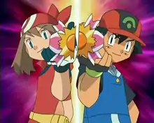 As the smoke clears, both Ash and May are left with the same amount of points, and the match is a tie. They are both happy about this and the crowd gives them a huge cheer, as Ash and May meet in the center of the field and shake hands. Nurse Joy presents the Terracotta Medal to Ash and May; however, she explains that there is only one Ribbon, so she doesn't know who to give it to, but Ash and May have an idea: May grabs the Ribbon, throws it in the air and Ash orders Sceptile to use Leaf Blade slicing the Ribbon in half so that both of them can share it.
