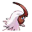 Absol is a quadrupedal, mammalian Pokémon with a dark blue to black body covered in white fur. It has a ruff around its neck and chest and a tuft on the top of its head adorned with a single blue-black oval. Between the dark skin, the curvature of the white fur on its head, and positioning of its horn, Absol's face vaguely resembles a wu wei symbol. It has a feline face with almond-shaped, red eyes, a scythe-like tail, and a crescent-shaped horn on the side of its head. Its broad feet are equipped with three claws each, and dewclaw-like spikes protrude from the heels of its hind legs and the elbows of its front legs. It walks with a pacing gait like that of a camel.