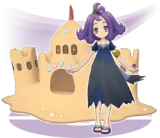 Acerola's design is based on her appearance in Pokémon Sun, Moon, Ultra Sun, and Ultra Moon. Palossand is Acerola's signature Pokémon in the core series games. Palossand's Dex entry comes from Pokémon Ultra Sun.