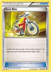 The Bicycle was introduced as an Item card in the Pokémon Trading Card Game during the English XY Series (the Japanese XY Era). First released in the Primal Clash expansion, it was later featured in the Japanese The Best of XY collection. When played, the Arco Bike allows the player to look at the top two cards in their deck. The player then chooses one of those cards and puts it in their hand. The remaining card is discarded.