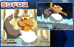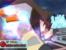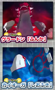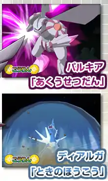 In Battrio 0, Advent acts as a 'finishing move', in that it becomes available to players when the opposing team's HP is low. Players eligible to activate Advent are notified by the appearance of the Advent symbol in the box below the team HP and next to the Fervor Gauge. If a player chooses to activate Advent, two halves of the Advent symbol appear on screen, and the player will be prompted to press the yellow confirm button as the two halves meet. Doing so will summon a Pokémon, or pairing of Pokémon to deal additional damage to the opponent's team. The amount of additional damage depends on the Pokémon summoned, which is random and varies depending on the expansion. As of the last Battrio 0 expansion, the possible Pokémon that could be summoned are listed below.