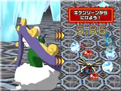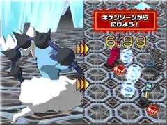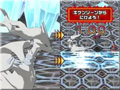 As in Battrio 0 the Pokémon summoned for Advent is random, though which one in Battrio V depends on the base colors of the team, with each base color having a unique roster of Pokémon that can be summoned. Summoning a Pokémon in Battrio V also starts a short minigame in which the opponent must try and avoid danger zones that will increase the amount of damage dealt to any Pokémon that strays into them. These danger zones are different for each Pokémon that can be summoned.