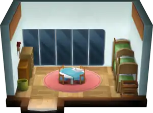 Much like every other facility owned or run by the Aether Foundation, the Aether House features a predominantly white color scheme. The main foyer contains a reception desk which stands in front of a staff room the player cannot access, and four doors leading to other rooms, two of which can be accessed by the player. An Oranguru, nicknamed Headmaster (Japanese: エンチョー Principal), can be seen at the back of this room. The door to the left leads to a playroom with some shelves, toys and a TV; while the door to the right leads to a bedroom with a table, some bookshelves, two bunk beds, a Mimikyu, a Wimpod, and two Aether Foundation Employees. During the post-game, the Aether scientist in this room will give the player a Porygon.