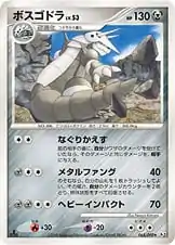 Aggron (Japanese: ボスゴドラ Bossgodora) is a Metal-type Stage 2 Pokémon card. It is part of the Rising Rivals expansion.