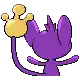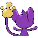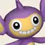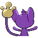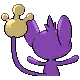 Aipom is a monkey-like Pokémon with a three-fingered hand at the end of its tail. Its fur is purple, while the skin of its face, inner ears, belly, feet, and the tip of its tail are beige. Its face usually has a cheeky smile and round, blue eyes. With its round ears, Aipom's head is disproportionately large compared to its body. Atop its head is a cowlick that is longer on females than males. Unlike its feet, Aipom's arms are simple, purple stubs.