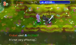 Crobat flaps its wings, releasing multiple light blue glowing saw disc-like energy blades from its wings at the opponent, or Crobat fires multiple light-blue glowing blades of energy at the opponent. | ||