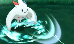 Togekiss spins its body in place, and its body glows light blue. Then, light blue energy appears around Togekiss and spirals around it, slashing the opponent, or a light blue energy ball appears in front of Togekiss's body and it fires it at the opponent. As the ball fires at the opponent, it turns into a beam, or Togekiss lifts up one wing and starts waving it around. Light blue energy streaks then appear and swirl around, forming into a ball above the tip of Togekiss's wing. It then tosses the ball at the opponent. | ||