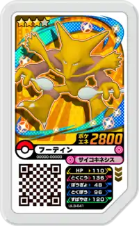 Alakazam (Japanese: フーディン Foodin) is a Grade 3 Pokémon Ga-Olé disk. It is part of the third Ultra Legend set.