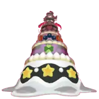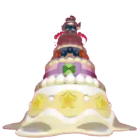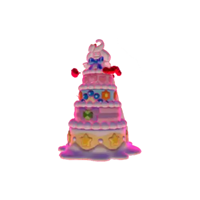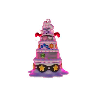 In its Gigantamax form, Alcremie's body resembles a towering, five-tiered cake. The apical tier of the cake resembles Alcremie's regular body, though it's wearing a bow and its whipped-cream "hair" is styled into a flamboyant swoop. Each layer of the cake features a variety of sweets that can be used to evolve Milcery. The bottom tier of its body is frosted yellow and adorned with an alternating row of star sweets and dotted frosting. The second tier is frosted pink and features a magenta bow topped with a clover sweet. The third tier is frosted blue and encircled with a row of flower sweets featuring a berry sweet arch. The fourth tier is frosted pink and encircled with love sweets and three red clouds, with the central sweet being larger than the rest. Lumps of whipped cream surround Gigantamax Alcremie's body between each of its tiers. Gigantamax Aclcremie's cream is said to be endlessly pouring.