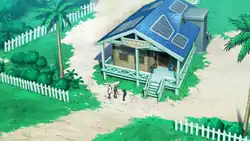 The player's house is located in the northeastern part of Hau'oli Outskirts. The player begins in their room in the house, which (unlike in earlier games) has only one story. The house's rooms and porch open onto the central family room and kitchen, where the player's mother and her (Kantonian) Meowth spend the majority of the game.