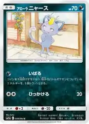 Alolan Meowth (Japanese: アローラニャース Alolan Nyarth) is a Darkness-type Basic Pokémon card. It is part of the Cosmic Eclipse expansion.