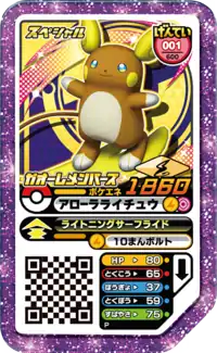 Alolan Raichu (Japanese: アローラライチュウ Alolan Raichu) is a Trophy Pokémon Ga-Olé disk. It is one of the Promotional disks.