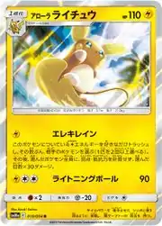 Alolan Raichu (Japanese: アローラライチュウ Alolan Raichu) is a Lightning-type Stage 1 Pokémon card. It is part of the Unified Minds expansion.