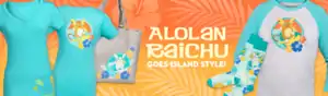 The Alolan Raichu Collection is a collection of merchandise released in the United States on April 27, 2017 exclusively through the U.S. Pokémon Center Online. The collection focuses on Alolan Raichu and has a tropical theme. The merchandise includes clothing and a tote bag. The tote bag was released later than the rest of the collection on May 17, 2017.