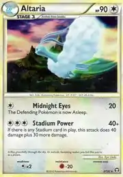 Midnight Eyes is an attack first seen on the Altaria from the Platinum expansion. Stadium Power is an attack originating from EX Deoxys Shiftry. This card's Pokédex entry comes from Pokémon HeartGold and SoulSilver.