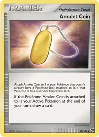 Amulet Coin was introduced as a Pokémon Tool card in the Pokémon Trading Card Game during the English Diamond & Pearl Series (the Japanese DP Era) in the Great Encounters expansion. When a player attaches this Trainer card to their Active Pokémon, they can draw an additional card at the end of their turn.
