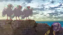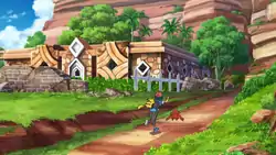 Ancient Poni Path first appeared in That's Some Spicy Island Research!, where Hapu was shown having a Poni radish farm there. When Ash and his classmates later passed by the farm and saw Hapu's Golurk picking up radishes, Ash tried to take a closer look, only for Hapu to have Golurk attack him and accuse him of stealing her radishes. Although Ash denied having stolen anything, Hapu refused to believe him, leaving Ash with no choice but to battle her. Despite the type disadvantage, Ash chose to use Pikachu against Golurk, having him use Iron Tail on the Automaton Pokémon's leg. However, when Pikachu attempted to repeat his move, Golurk grabbed Pikachu and slammed him into the ground, before using High Horsepower and defeating Pikachu.