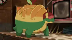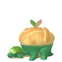Appletun is a dragon-like Pokémon inhabiting a body reminiscent of apple pie. Its body is mostly green with a yellow underside and lower jaw, and has an orange spot on its chest that resembles an apple core[1]. It has a piece of an apple on its head worn as a helmet. Its eyes usually droop down from under the apple helmet as though they were ears, but may be lifted up to reveal leaf-like eyestalks holding small beady eyes. It has black slits for nostrils on the tip of its muzzle. It has a large hump on its back with a several overlapping stripes that resemble an apple pie's crust. It has red and green leaves on the top of its pie-like back. It has short, bulky legs with paws, and a stout tail.
