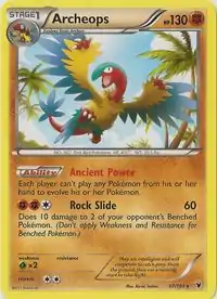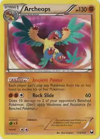 Ancient Power and Rock Slide are both moves in the Pokémon games that Archeops can learn. This card's Noble Victories Pokédex entry comes from Pokémon Black. The Dark Explorers print features the Shiny version of Archeops.