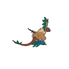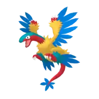 Archeops is a large, avian Pokémon that bears traits of both birds and reptiles. Its featherless, scaly snake-like head is red with a green stripe running along the top. Its mouth is filled with sharp teeth. Its eyes are white with black pupils and no irises. Its body is covered with frayed-looking, yellow and blue feathers designed for flight on its arms and legs enabling all four of its limbs to act as wings. All of these "wings" bear sharp claws. It has a ring of smaller green feathers on the ankles. Its tail is completely red and featherless except for a fan of blue feathers at the end, and as with the Archaeopterygiformes, it has fully-movable vertebrae in its tail instead of a pygostyle. Its plumage is very delicate.
