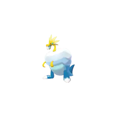 By shaking its freezing upper half, Arctozolt can generate electricity. It was known to live on ancient shores and preserved its food with the ice on its body. It allegedly went extinct because it moved very slowly, but this is likely not the case due to Arctozolt being combined from two separate Pokémon that each had their niches before going extinct.