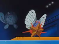 In The Water Flowers of Cerulean City, Butterfree was used in Ash's Cerulean Gym battle against Misty, where it faced her Staryu. Butterfree managed to hit Staryu with Tackle and then dodged Staryu's. As Staryu landed, it lost its balance, giving Butterfree the chance to hit it with two more Tackles. Staryu then scored a hit with Water Gun and kept firing off the attack. Butterfree, however, dodged them all and crippled Staryu with Stun Spore. Misty had Staryu jump into the water to wash the spores off. When Butterfree went for Sleep Powder, Staryu dodged it by diving into the water and kept using Tackle from underwater. Butterfree was then struck by a Tackle and knocked into the water. With its wings wet, Ash was forced to concede the round and recall Butterfree to the safety of its Poké Ball.