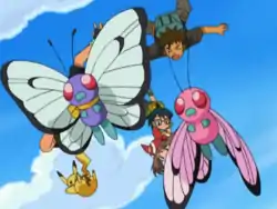 In Tentacool & Tentacruel, Butterfree flew Bulbasaur into battle with a giant Tentacruel, but it was knocked out by Tentacruel's attack. The last time Butterfree was seen with Ash was in Bye-Bye Butterfree. At the start of this episode, Ash saw a large number of Butterfree flying around in the sky, and Brock told him that it was the Butterfree mating season. Ash realized that his Butterfree would probably want to have babies like the other Butterfree, so he and his friends rented a hot air balloon and watched Butterfree mingle with the others. Despite Brock's encouragement for Butterfree to choose one belonging to a cute female Trainer, Butterfree had its heart set on a pink Butterfree. It tried to impress the pink Butterfree with some fancy flying, only to be rejected with a slap to the face. Heartbroken, it flew into the woods below, followed by Ash and his friends who tried to encourage Butterfree, telling it to be assertive and tying a yellow ribbon around its neck to help it catch the pink Butterfree's eye. Butterfree tried a second time to impress the pink Butterfree with its Whirlwind and Tackle attacks, but this tactic also failed. Then, Team Rocket showed up in a helicopter and captured all the Butterfree, with exception of Ash's, in a giant net. Butterfree pursued them, followed by the group in their hot air balloon, and they headed into a canyon where the Butterfree were stashed. While Ash handled the Rocket trio, Butterfree freed the captured Butterfree from their cage. Team Rocket tried a second time to capture all the Butterfree, only to be stopped by both Butterfree and Pikachu. Afterward, the pink Butterfree approached Ash's Butterfree and the two paired up. The two departed as Ash watched in tears, remembering what the two had been through together and wishing his dear friend a fond farewell.