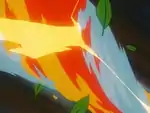 Charizard was used to weaken and help Ash capture a Chikorita in The Chikorita Rescue. His massive size compared to her came into effect when Chikorita ran towards him and tried to attack; Charizard responding by placing his foot out and blowing a small puff of fire after being instructed by Ash to only weaken her. Charizard's puff of fire ended up on Chikorita's single leaf and caused her to run around for a short amount of time before using Vine Whip to attack Charizard. Charizard was recalled by Ash after he and Chikorita fell into a large canvas of rocks.