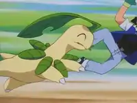 In Gettin' The Bugs Out, Ash used Chikorita as his second Pokémon in his Azalea Gym battle, despite the type disadvantage, something which Bugsy mocked. First, she went up against Spinarak, who dodged a lot of her attacks, until it was stopped by Chikorita's Sweet Scent and then defeated with a Tackle. She then went up against Metapod, which used Harden to defend itself, before defeating Chikorita with a Tackle of its own.