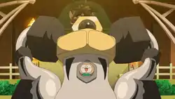 In A Full Battle Bounty!, after withdrawing Pikachu, Ash sent Melmetal out to face Empoleon during his exhibition match against Professor Kukui. Melmetal was easily able to endure Empoleon's attacks before defeating it with Double Iron Bash. Kukui next sent out his Incineroar. Although Melmetal endured Incineroar's Darkest Lariat, its attempt to retaliate with Double Iron Bash backfired when Incineroar caught the attack. Although Melmetal seemingly overpowered Incineroar in the contest of raw strength that followed, Incineroar overwhelmed Melmetal and defeated it with a close-range super-effective Blast Burn.