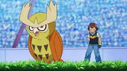 Noctowl was the Pokémon Ash based his Ecruteak Gym campaign around in From Ghost to Ghost. It successfully used Foresight on Gastly, but had to be recalled because it couldn't land any other attacks. It was then sent out against Haunter, struggling to overcome the Ghost type but managed to win through learning Confusion. It was then left to battle Morty's Gengar which was still fresh, and looked vulnerable as Gengar was able to attack while invisible. However, Noctowl was able to reveal Gengar's location by using Confusion through the whole building and then using Foresight to keep Gengar visible. It then finished Gengar off with a Tackle attack and Ash got the Fog Badge.