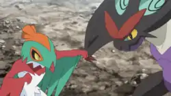 The two Flying-types were then tied up to a tree. Noibat tried to use Supersonic on them but failed due to Team Rocket's soundproof earphones. Hawlucha managed to cut the rope using his nails and tried to sneak away along with Noibat, but they were soon spotted by Team Rocket. Hawlucha successfully escaped with Noibat, after attacking Inkay with High Jump Kick, and knocking him down together with Pumpkaboo. As they were still being pursued by the trio, Noibat spotted a cave and told Hawlucha to hide in there. Inside the pitch-black cave, Jessie, James, and Meowth tried to capture them and lure them into a trap set by Inkay and Pumpkaboo. Noibat used echolocation to sense the trio and had Hawlucha kick off their soundproof headphones, which allowed Noibat to use Supersonic, causing Team Rocket to flee. After Ash appeared and defeated Team Rocket with Frogadier and Pikachu, the two Flying-types left the cave. Afterward, Noibat accepted Ash's offer to go with him and allowed himself to be captured in a Poké Ball. He was then let out, allowing him to train with Hawlucha and Fletchinder again.